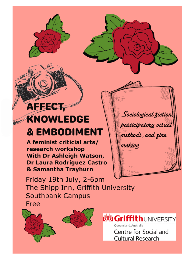 AKE workshops involve short introductions to each method, followed by a practical workshop where participants collaboratively experiment to explore themes of affect, knowledge, and embodiment. We produce a zine on the day, a ‘curated sociology’ of photography, research writing and fiction interventions, to be published with Frances St Press. AKE Zine is a collaboratively produced critical feminist arts/research publication (ISSN 2651-8724 [Online]).